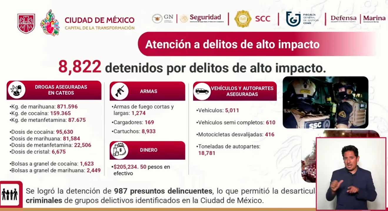 La Jefa de Gobierno señaló que la disminución sostenida de delitos de alto impacto en toda la ciudad responde al trabajo conjunto entre autoridades federales, estatales y los gobiernos locales. En estas acciones participan la Secretaría de Seguridad Ciudadana, la Fiscalía General de Justicia, el C5, así como instancias federales como la SEDENA y la Guardia Nacional.