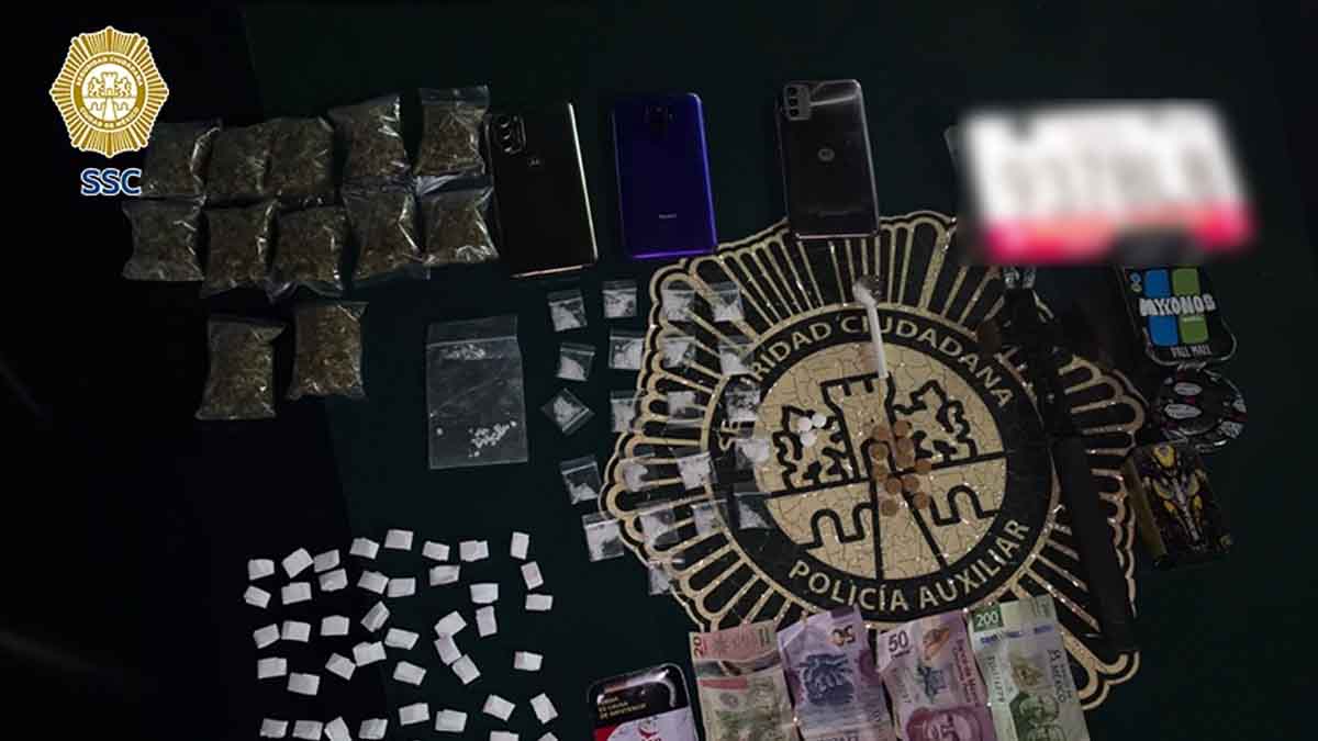 Como resultado, aseguraron 85 envoltorios con una sustancia con características de cocaína, 12 bolsitas con hierba similar a la marihuana y 14 pastillas que podrían ser psicotrópicas, además de dinero en efectivo.